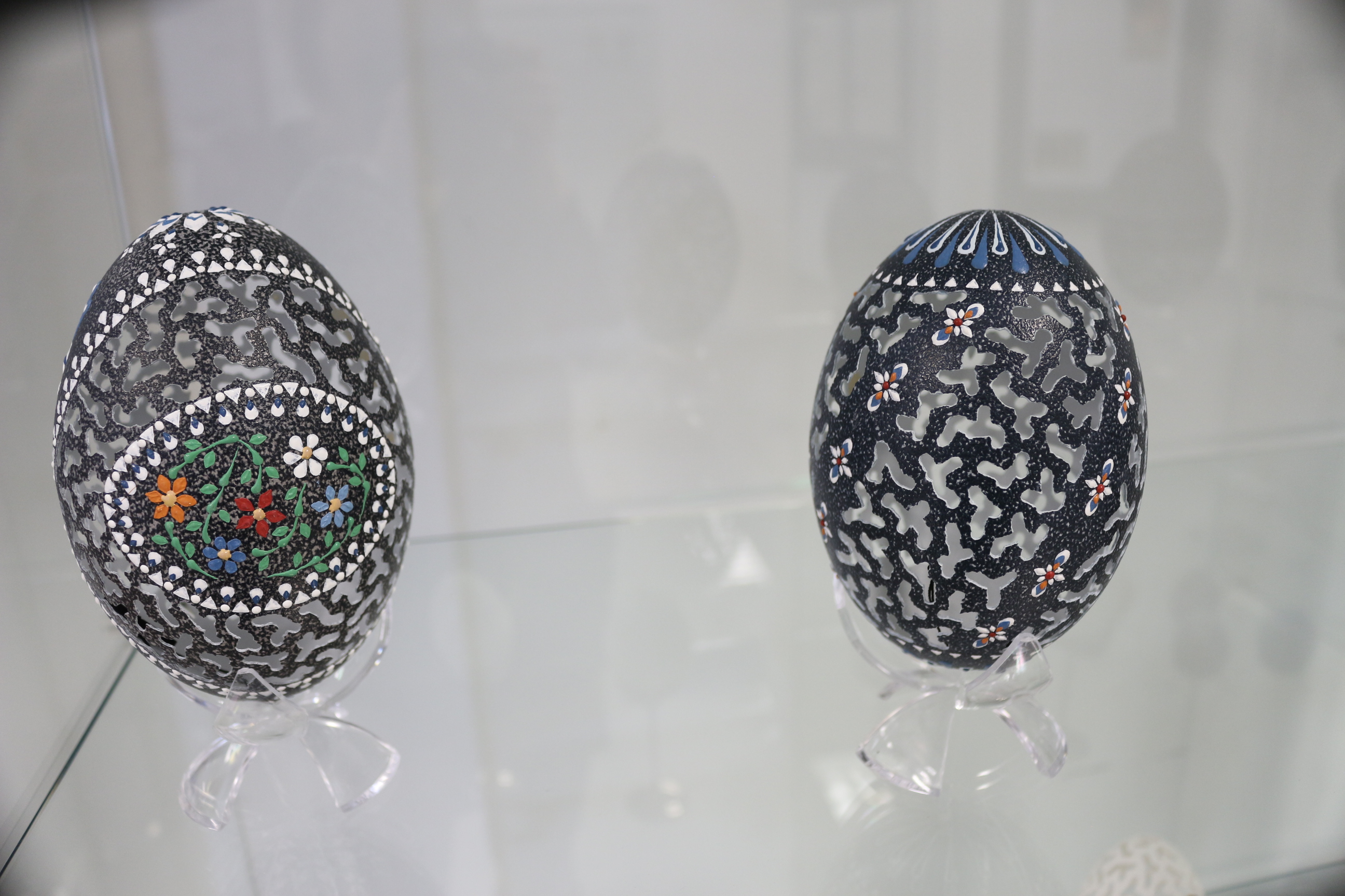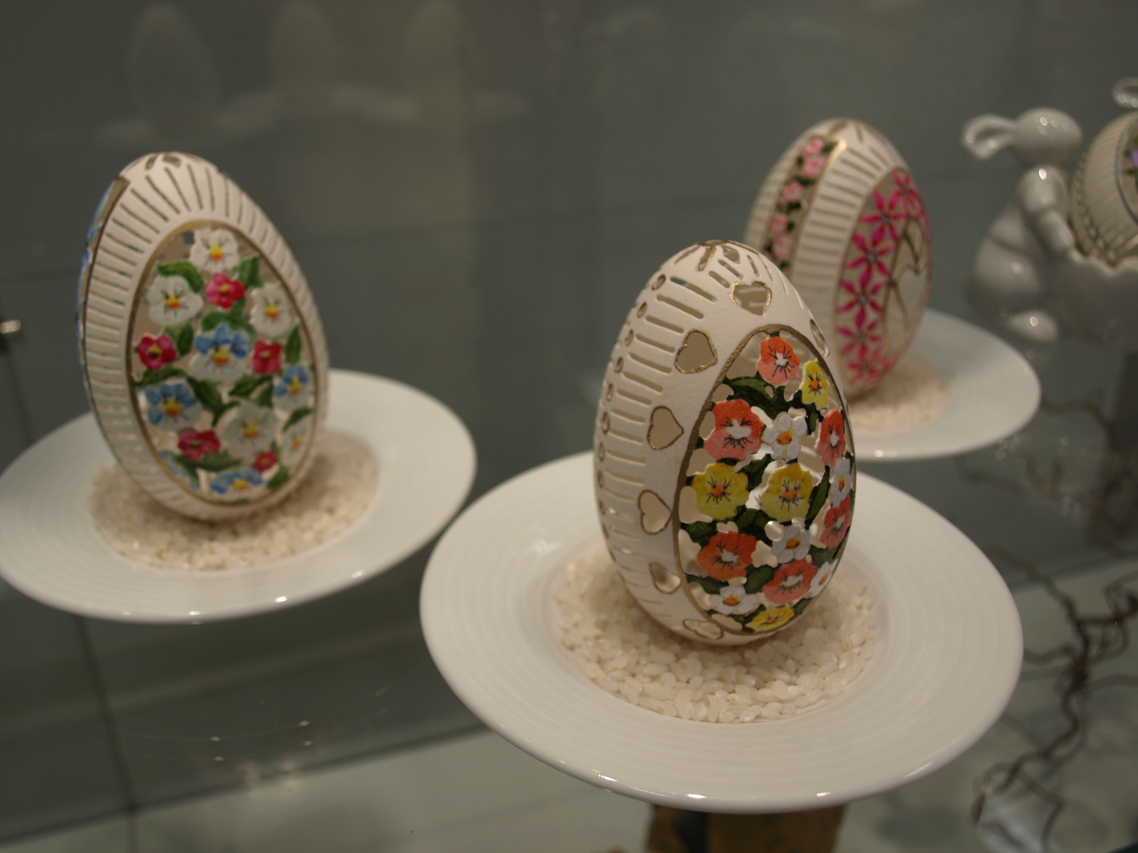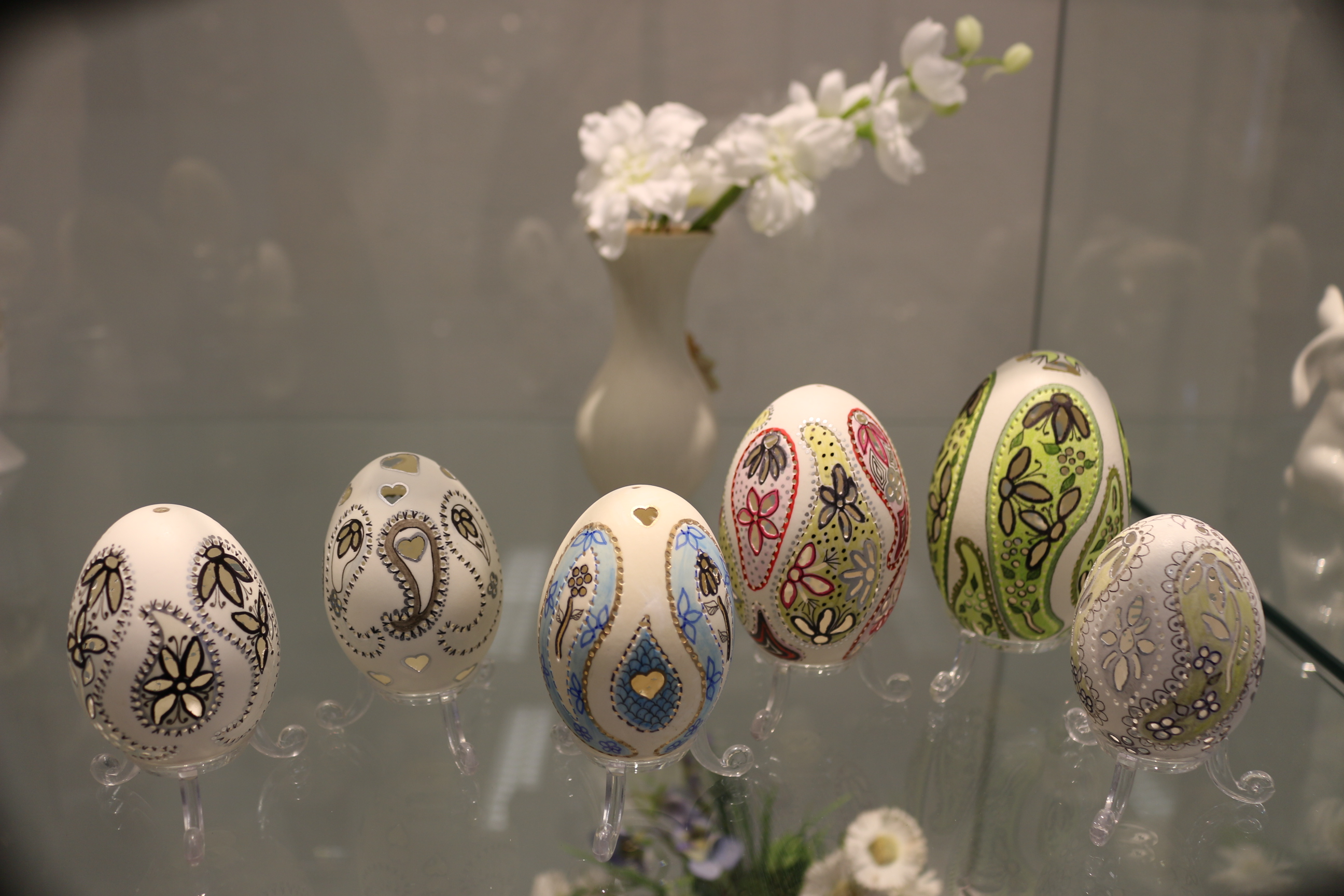 Zu sehen ist in der diesjährigen Schau auch wieder eine Auswahl an Eiern im sogenannten Paisleymuster. Dabei handelt es sich um ein abstraktes, ornamentales Muster, das sehr an den Orient erinnert. In seiner Grundform stellt es ein Blatt mit einem spitz laufenden, gebogenen Ende dar. Neu in diesem Jahr sind ihre sogenannten Strahleneier. Der Name entstand aus den strahlenförmigen Mustern. Viele dieser Werke aus der neuen Serie sind in der diesjährigen Osterausstellung zu sehen.