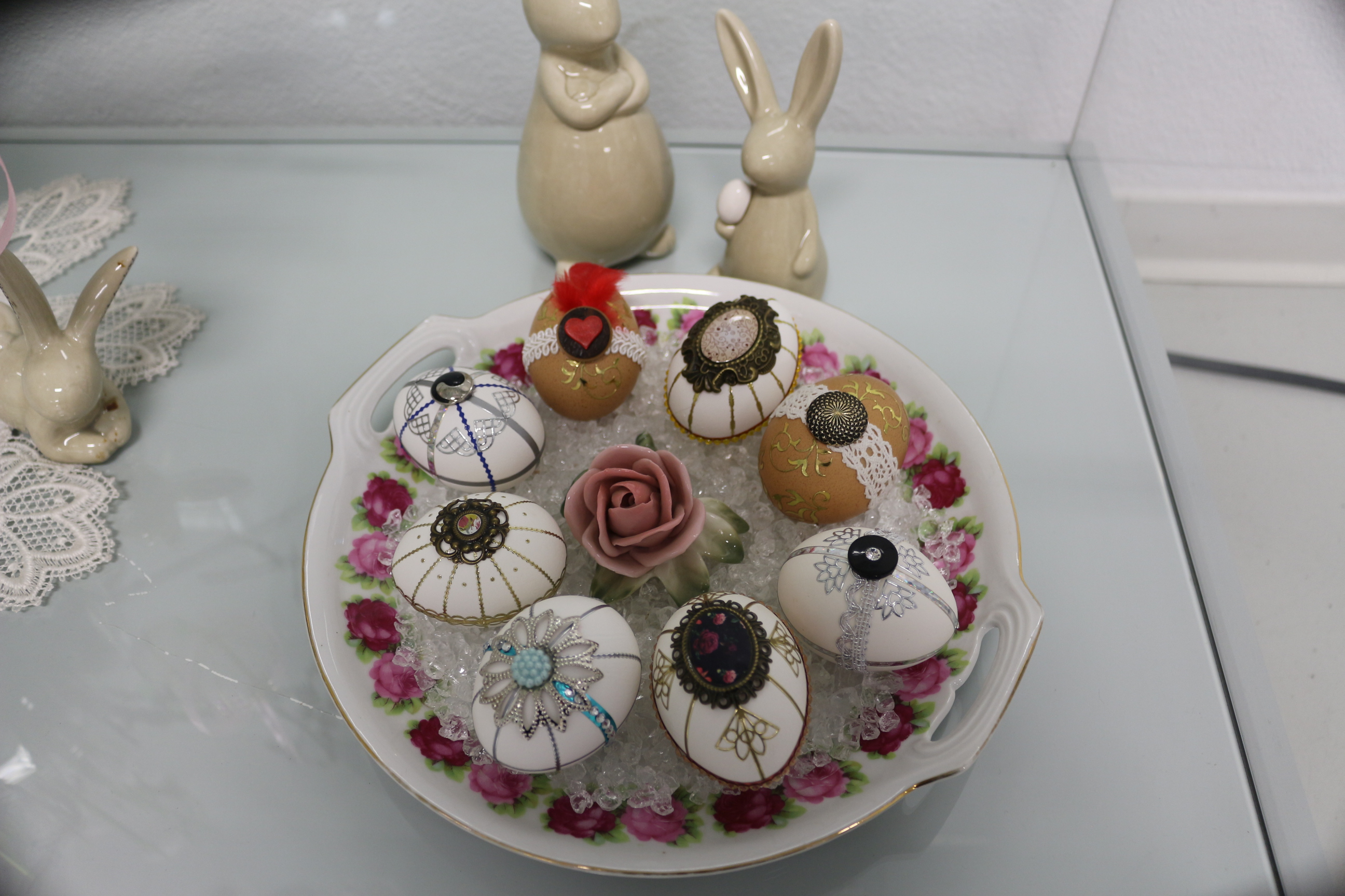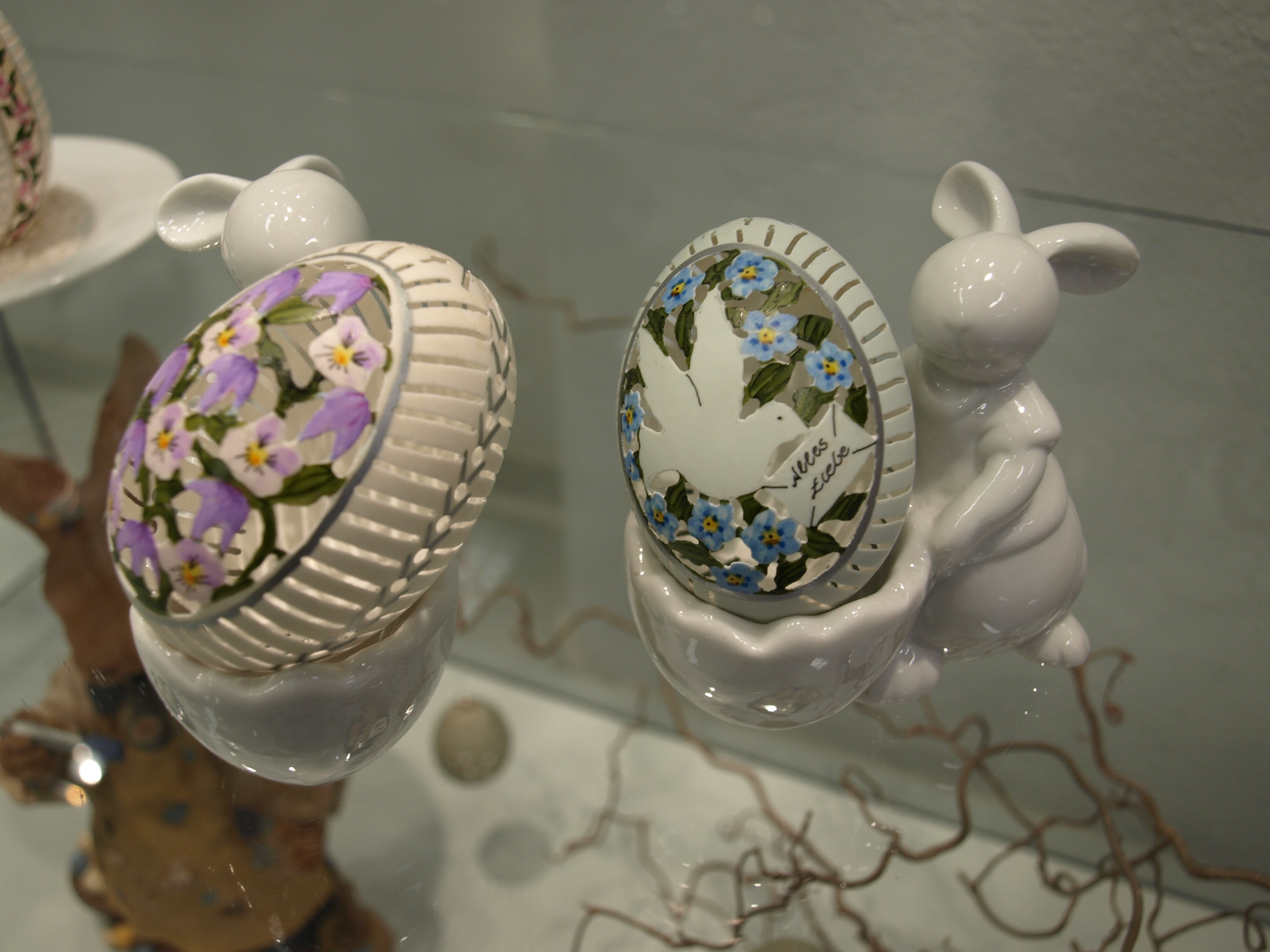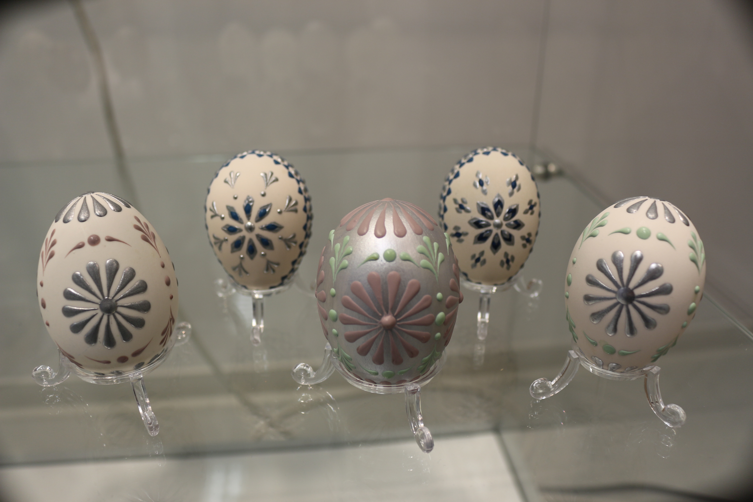 Zu sehen ist in der diesjährigen Schau auch wieder eine Auswahl an Eiern im sogenannten Paisleymuster. Dabei handelt es sich um ein abstraktes, ornamentales Muster, das sehr an den Orient erinnert. In seiner Grundform stellt es ein Blatt mit einem spitz laufenden, gebogenen Ende dar. Neu in diesem Jahr sind ihre sogenannten Strahleneier. Der Name entstand aus den strahlenförmigen Mustern. Viele dieser Werke aus der neuen Serie sind in der diesjährigen Osterausstellung zu sehen.