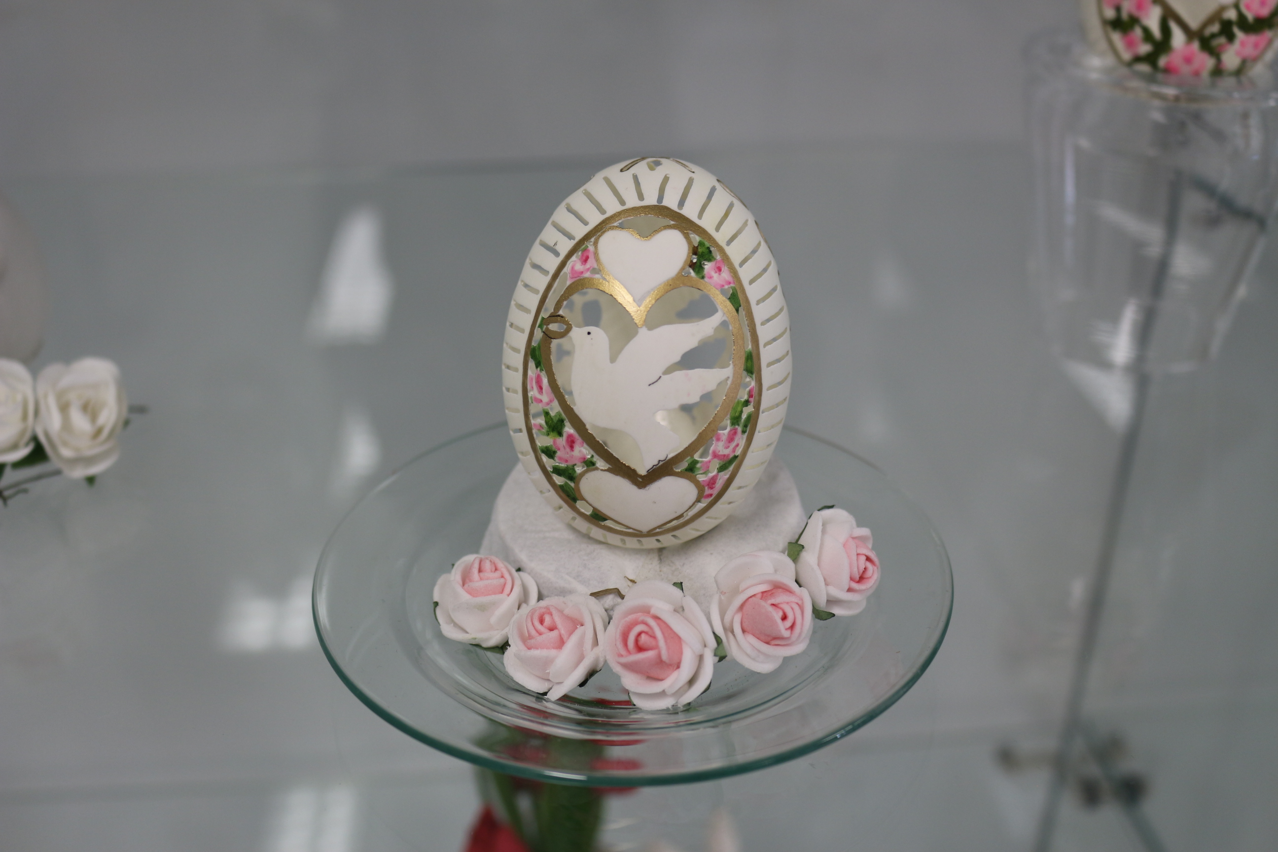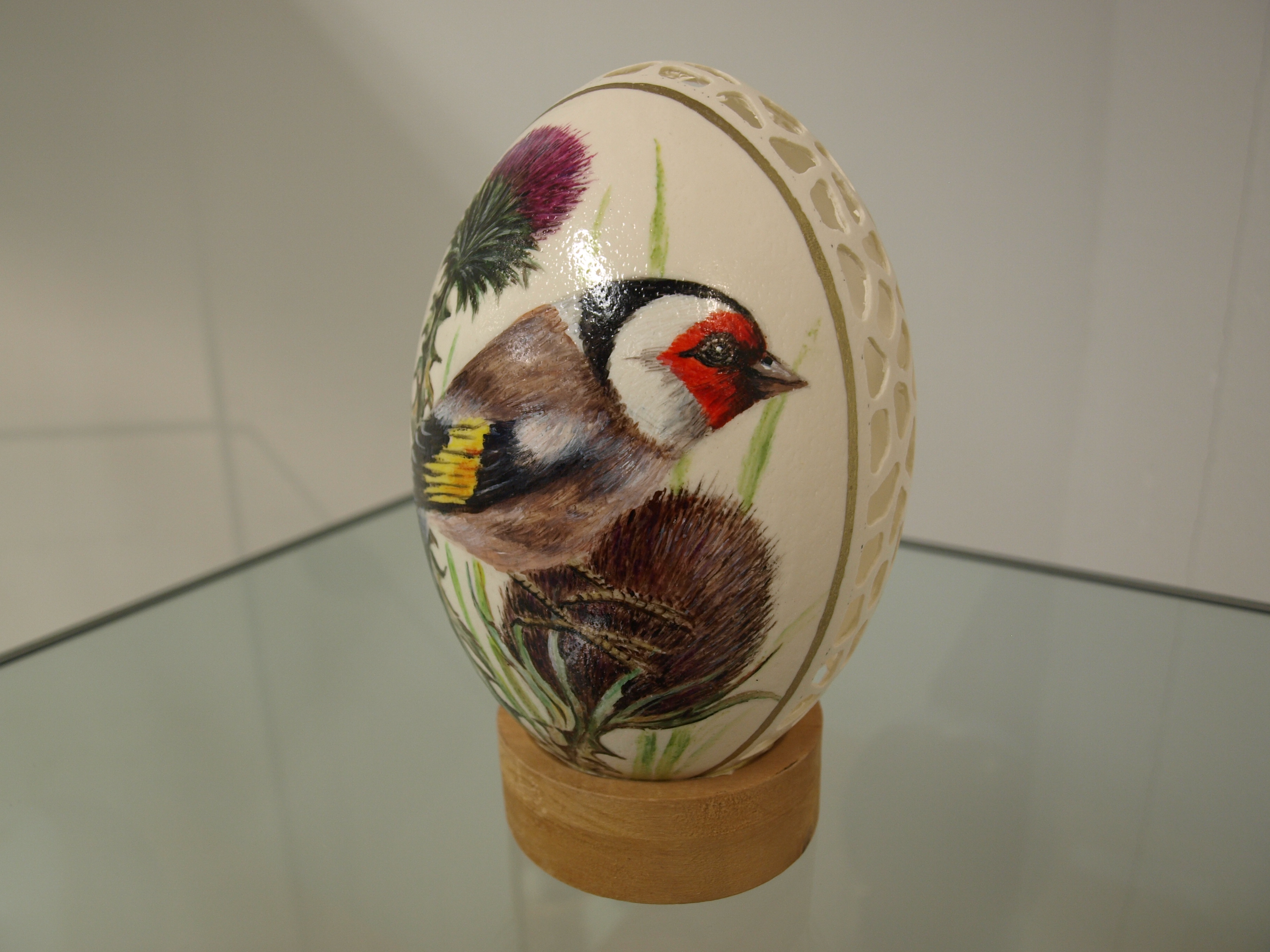 Inge Ewersbach begeistert uns bereits seit 2012 mit ihren filigranen Kunstwerken, die mittels ihrer eigenen Durchbruchtechnik entstehen. Jedes Jahr aufs Neue schafft sie auf diese Weise neue, kreative und einmalige Kunstwerke am Naturei. Auch in diesem Jahr präsentiert sie wieder neue Arbeiten aus der heimischen Werkstatt. Als Grundlage dienen ihr verschiedene Natureier wie Wachtel-, Tauben-, Hühner-, Enten-, Gänse- oder auch Straußeneier. Durch die besonders filigrane Durchbruchtechnik lassen sich wundervolle Durchbrucheier mit variablen Mustern herstellen, die ganz individuell gestaltet werden können. Diese Muster entstehen mittels eines Zahnartbohrers. Neben den schlichten weißen Durchbrucheiern gibt es von Inge Ewersbach auch künstlerisch durchbrochene Natureier, die anschließend farblich gestaltet werden. Hierbei reicht ihr Repertoire von Tieren und Blumen bis hin zu ganzen Naturlandschaften und den sogenannten Sprucheiern mit Reimen oder Weisheitssprüchen. Weiterhin fertigt sie individuelle Hochzeits- und Geldscheineier. Mittels ihrer Durchbruchtechnik hat sie aus einem Straußenei sogar schon ein stilvolles Lichtei entstehen lassen.